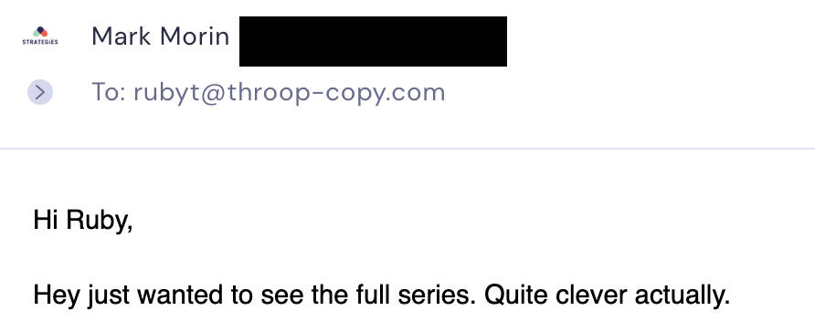 who has helped dozens of clients take their emails from inbox-white-noise → to emails that stand out in a sea of sameness and convert their resident lurkers into buyers.