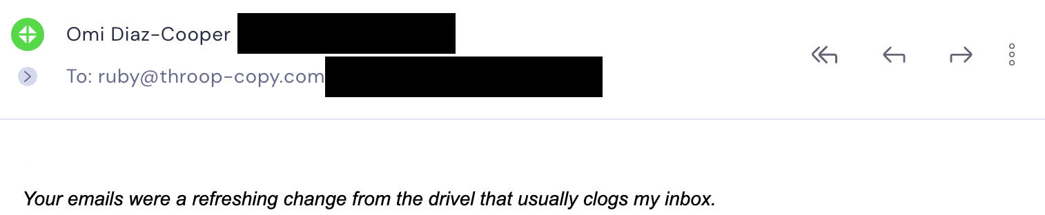 who has helped dozens of clients take their emails from inbox-white-noise → to emails that stand out in a sea of sameness and convert their resident lurkers into buyers.