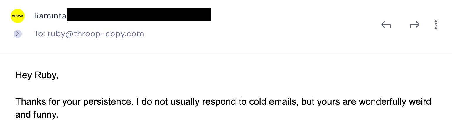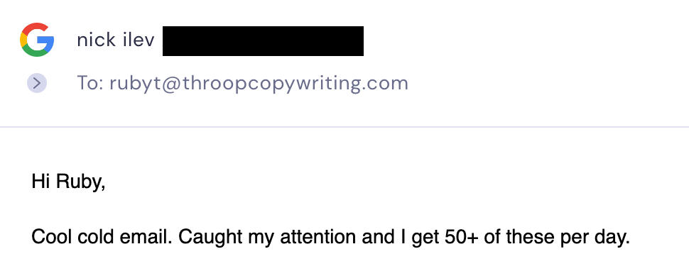 I create scroll-stopping subject lines (which are actually relevant to the email, not cheap clickbait), so you have the best chance of bagging your prospect.2. The Mother Of All Hooks